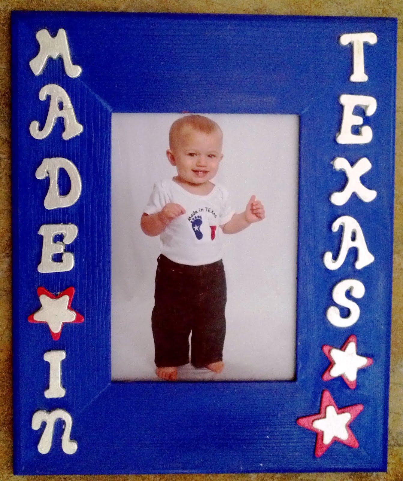 While the frames dried, I sorted through my leftover letters to spell out something that made sense. “Made in Texas” and “My Airman” were obvious – and I was lucky enough to have all the letters I needed. “USA” was easy as well, but picking out something baseball-y, well that required the assistance of John. For two or three days, we struggled with words. John desperately wanted to spell out “Slugger,” but I didn’t have all the required letters – and I was determined to use up what I had rather than buy more. Then we tried “First Base,” and “Coach.” Finally John pieced together “Homerun” and that fit!