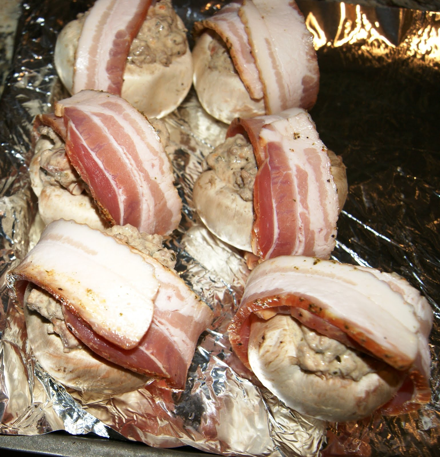 beef with a can of Italian style diced tomatoes, a ½ tub of tomato and basil flavored Philadelphia Cooking Cream. I pulled the stems out of the mushrooms and scrubbed down the heads. Once the meat was brown, I drained the excess liquid, turned off the burner and stirred in the cooking cream. I mixed the ingredients together and spooned the mixture into the mushroom caps. And then I wrapped them in bacon as well.