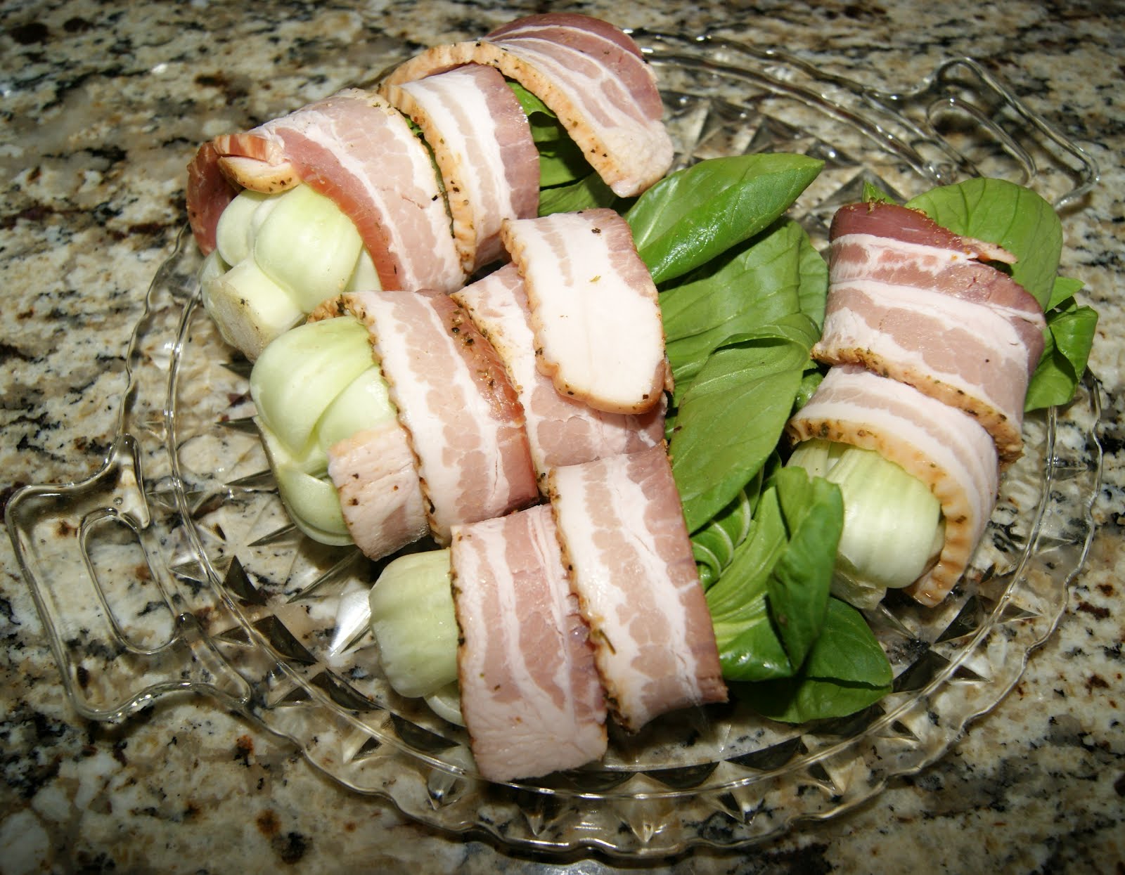 I’d had grilled boc choy before and it was amazing! And of course everything tastes better with bacon, right? So I combined the two, wrapping a bacon strip around a piece of bok choy and pinned it with a toothpick. Simple.