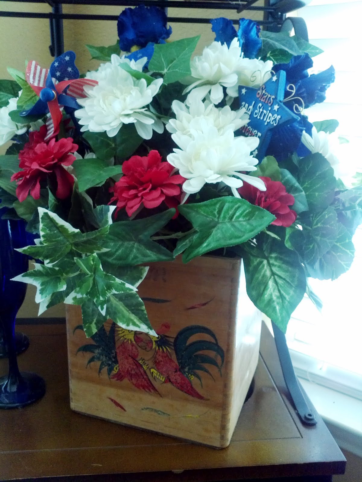 Not one to let such treasures hide away, I used them as pots to create greenery arrangements: Silk greenery with red, white and blue flowers, garnished with a few seasonal picks. Every year, I trot them out as part of my summer decorating scheme. This year, they’re going on my free standing wine rack.