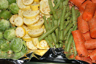 In this version, I used Brussels sprouts, summer squash, fresh snap beans and carrots. I brushed the veggies with olive oil and then seasoned with Weber’s garlic and herb seasoning.
