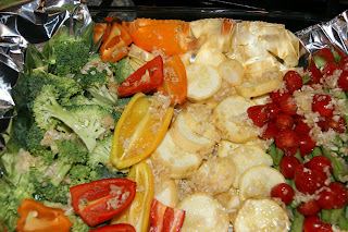 In this dish, I roasted broccoli, small yellow, orange and red peppers, summer squash, fresh snap beans and grape tomatoes. Earlier, I’d mixed olive oil with minced garlic and let that sit for a couple of hours. When I was ready to cook, I poured the mixture over the veggies.