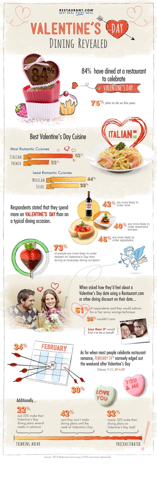 Restaurant.com, the nation's largest dining deals site, reveals details about diners' plans for restaurant romance this Valentine's Day. A recent survey by the company found that nearly half (49 percent) of respondents selected Italian as the cuisine of choice for a Valentine's Day meal over romantic rivals fondue (12 percent) and French (11 percent).More than half of respondents (52 percent) also consider a meal at an Italian restaurant the most romantic option overall, followed by French (22 percent) and Fondue (15 percent). Lovebirds planning a romantic date should avoid tortillas and seaweed: Mexican food (44 percent) and sushi (34 percent) were deemed the least romantic cuisines.
